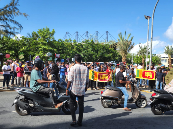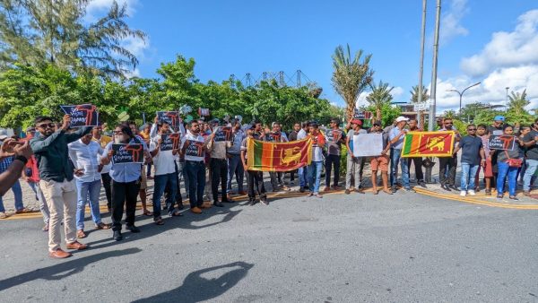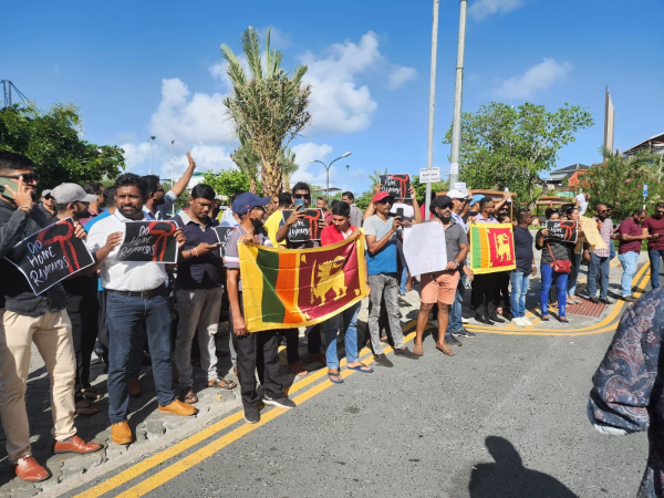 மாலைதீவு அரசாங்கம் ஜனாதிபதி கோட்டாபயவிற்கு பாதுகாப்பான புகலிடத்தை வழங்கியமைக்கு எதிர்ப்பு தெரிவித்து அங்குள்ள இலங்கையர்கள் ‘“அன்புக்குரிய மாலைதீவு நண்பர்களே குற்றவாளிகைளை பாதுகாக்க வேண்டாமென உங்கள் அரசாங்கத்திற்கு வலியுறுத்துங்கள்” என கோஷங்களை எழுப்பியவாறு ஆர்ப்பாட்டத்தில் ஈடுபட்டனர்.