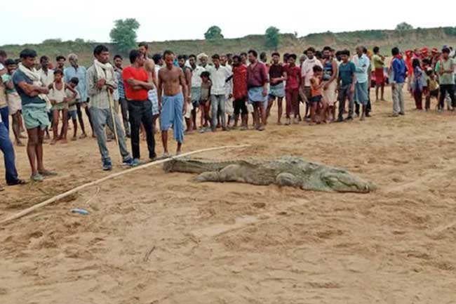 இதை கண்ட கிராம மக்கள் முதலையை வலைவீசி பிடித்தனர். பின்னர் அதனை கயிறு கட்டி கரைக்கு இழுத்து வந்தனர்.