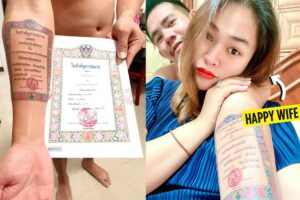 இதனையடுத்து பச்சை குத்தும் நிலையமொன்றுக்குச் சென்ற அவர் தனது திருமண சான்றிதழை மணிக்கட்டில் முழுதாகப் பச்சை குத்தியுள்ளார்.