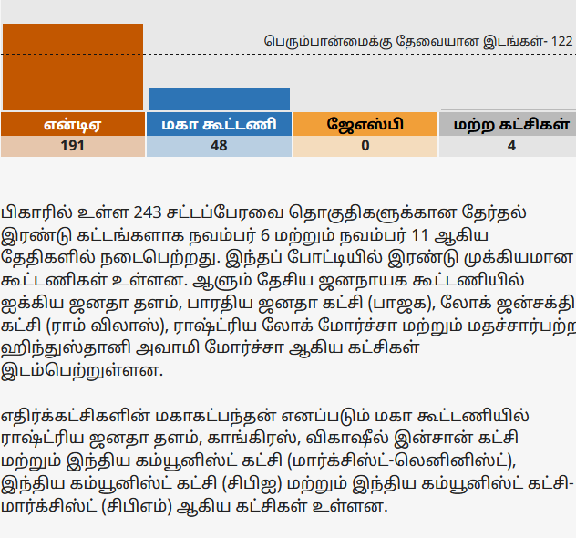 243 தொகுதிகளைக் கொண்ட பிகார் சட்டப்பேரவையில், பெரும்பான்மை பெற 122 இடங்களில் வெற்றி பெற வேண்டும்.