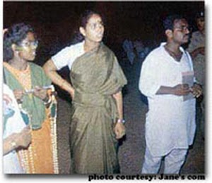 வரிசையில் நிற்காமல், பின்னாடி நின்றிருந்த பெண் ஒருவர் மாலையுடன் முன்னே வருவதைக் கவனித்து விட்டார் சப் இன்ஸ்பெக்டர் அனுசுயா. உடனே வேகமாகச் செயற்பட்ட சப் இன்ஸ்பெக்டர் அனுசுயா, கண்ணாடி அணிந்த சல்வார் கமீஸ் பெண்ணைத் தடுக்க முயன்றார்.