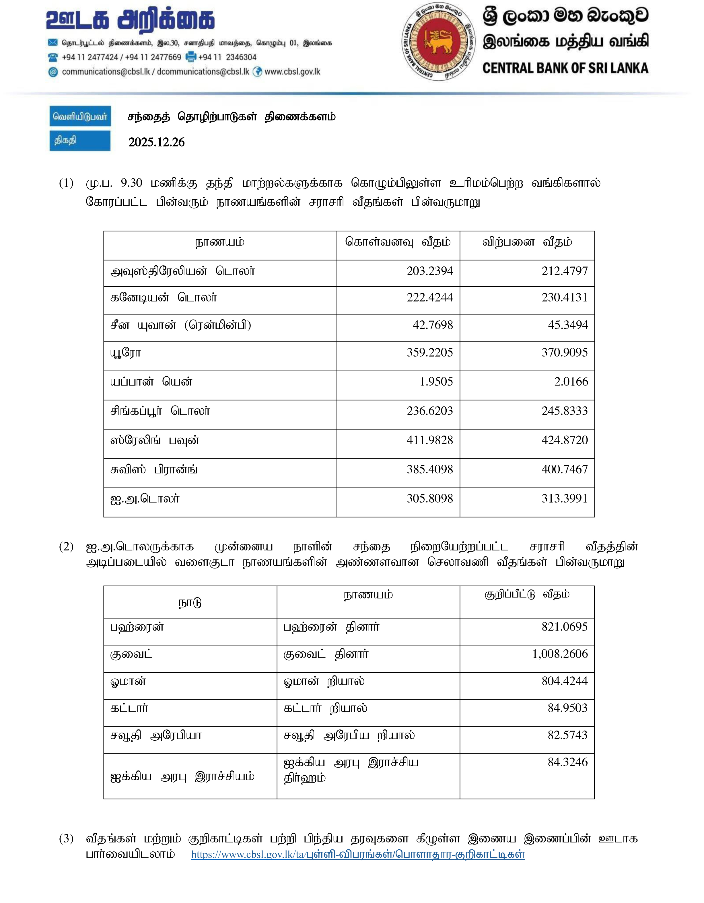 இலங்கை மத்திய வங்கியினால் வெளியிடப்பட்டுள்ள இன்றைய நாணய மாற்று விகிதங்கள் வருமாறு,