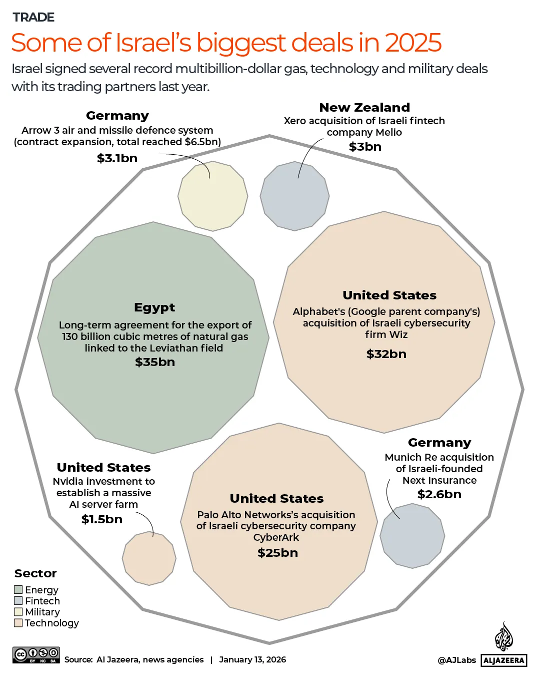 இந்தக் கதையில், 2025 ஆம் ஆண்டில் இஸ்ரேலுடன் கையெழுத்திடப்பட்ட, பொதுமக்களுக்கு வெளிப்படையாக அறிவிக்கப்பட்ட மிகப்பெரிய ஒப்பந்தங்களில் சிலவற்றை அல் ஜசீரா விரிவாக அலசுகிறது