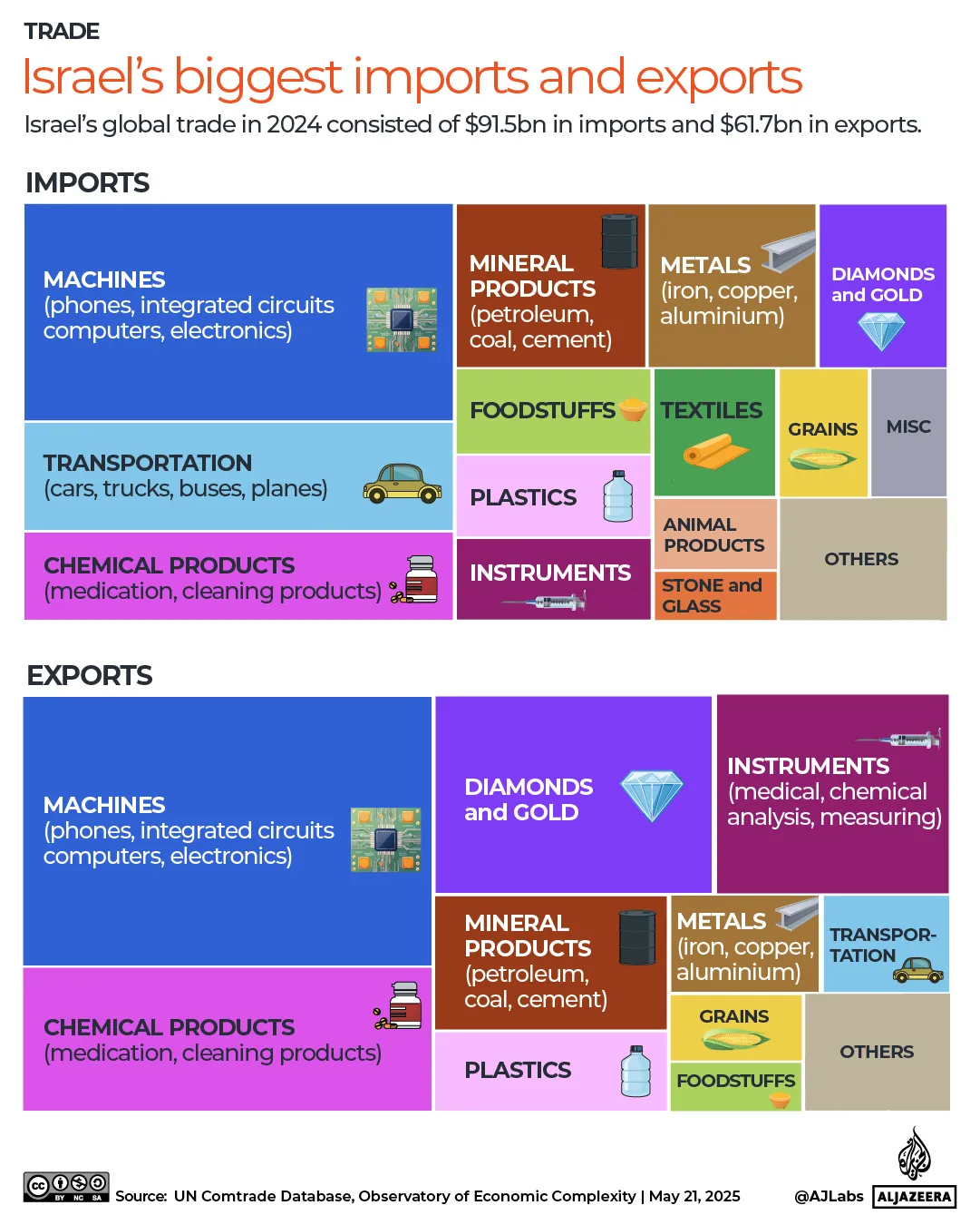 இஸ்ரேலின் முக்கிய இறக்குமதிகள் மற்றும் ஏற்றுமதிகள் இவ்வாறு உள்ளன: