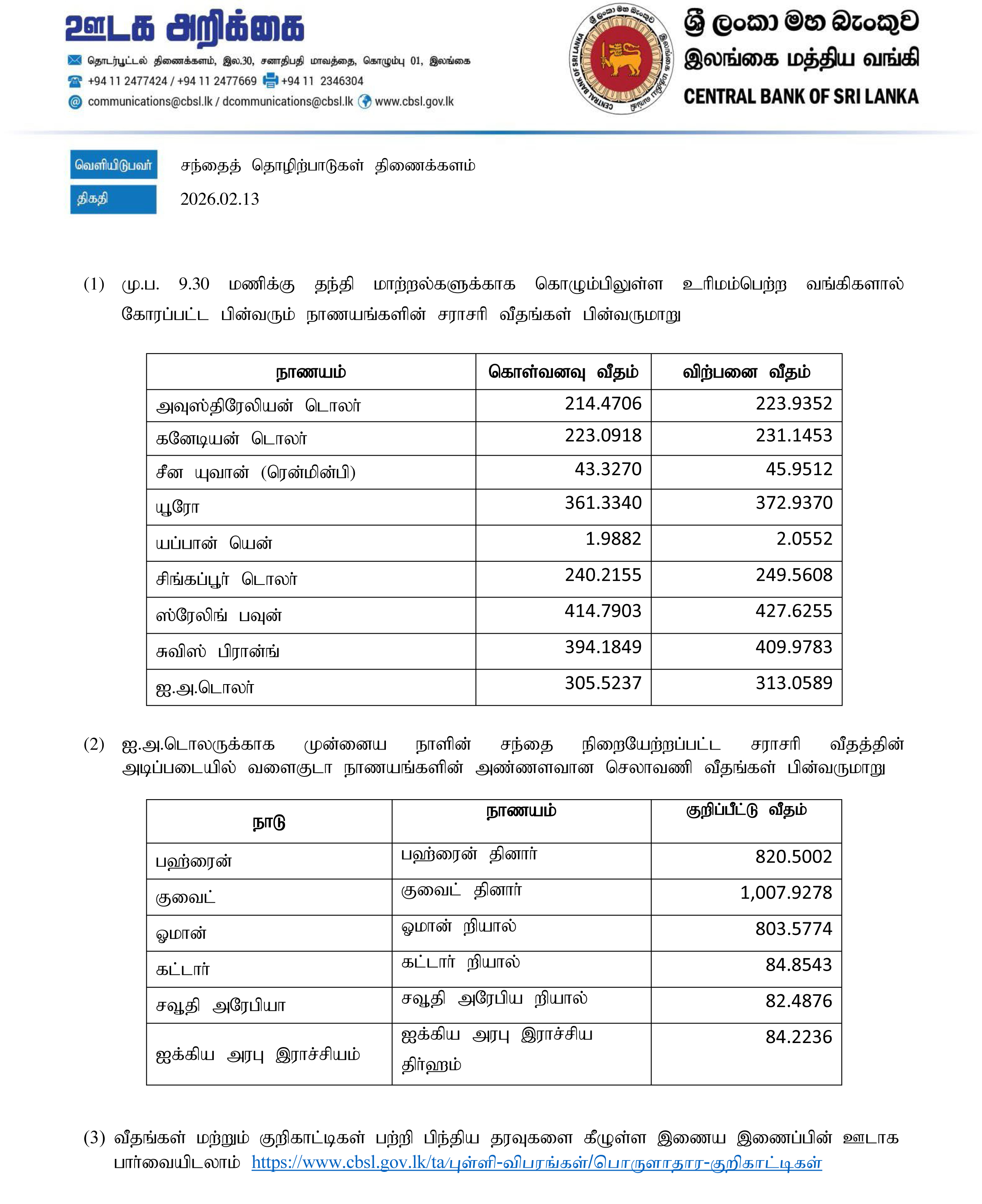 இலங்கை மத்திய வங்கியினால் வெளியிடப்பட்டுள்ள இன்றைய நாணய மாற்று விகிதங்கள் வருமாறு,