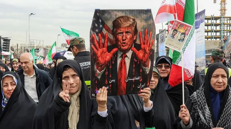 இரானிய ஆட்சியின் ஆதரவாளர்கள் 2026 இல் அதிபர் டிரம்புக்கு எதிராக ஆர்ப்பாட்டம் நடத்தினர்.