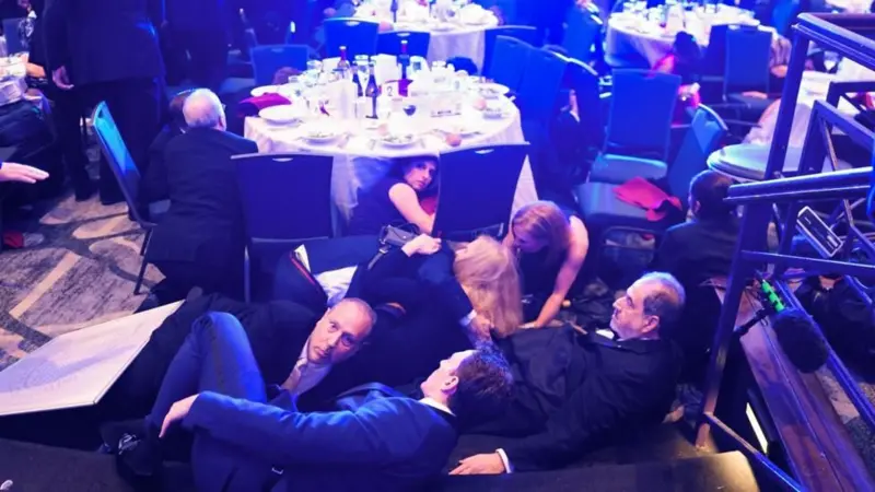 டிரம்ப் கலந்து கொண்ட விருந்து நடைபெற்று வந்த அரங்கில் திடீரென துப்பாக்கிச் சூடு சத்தம் கேட்டதால் அங்கு கூடியிருந்த செய்தியாளர்கள் அனைவரும் மேசைகளுக்கு கீழே தஞ்சமடைந்தனர்.